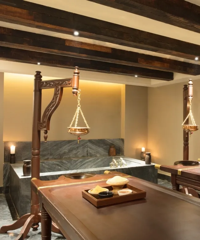 Inspiriert von jahrtausendealten ayurvedischen Traditionen und tief verwurzelt in ganzheitlichem Wohlbefinden, erwartet Sie eine außergewöhnliche Spa-Erfahrung, die Körper, Geist und Seele in Einklang bringt. Das vielfältige Angebot reicht von belebenden Körperpackungen und entgiftenden Bädern bis hin zu Chakra-Balancing-Ritualen und entspannenden Massagen. Unsere erfahrenen Therapeuten vereinen traditionelle rajasthaniische Heilmethoden mit modernen westlichen Techniken, während natürliche Inhaltsstoffe und regionale Heilkräuter für eine luxuriöse Pflege sorgen.