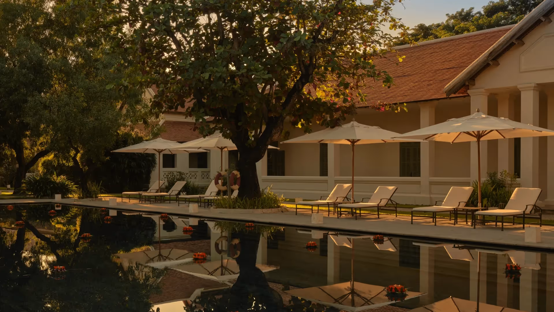 Elegant und zeitlos: Die Pool Suiten bieten 117 m² stilvolle Wohnfläche, umgeben von einer großzügigen Terrasse mit Garten, privatem Sala und großem Pool. Inspiriert vom buddhistischen Erbe der Region, sind die lichtdurchfluteten Innenräume klar und harmonisch gestaltet – mit Wohnzimmer, Bibliothek, Arbeitsbereich und einem King–Size–Himmelbett.