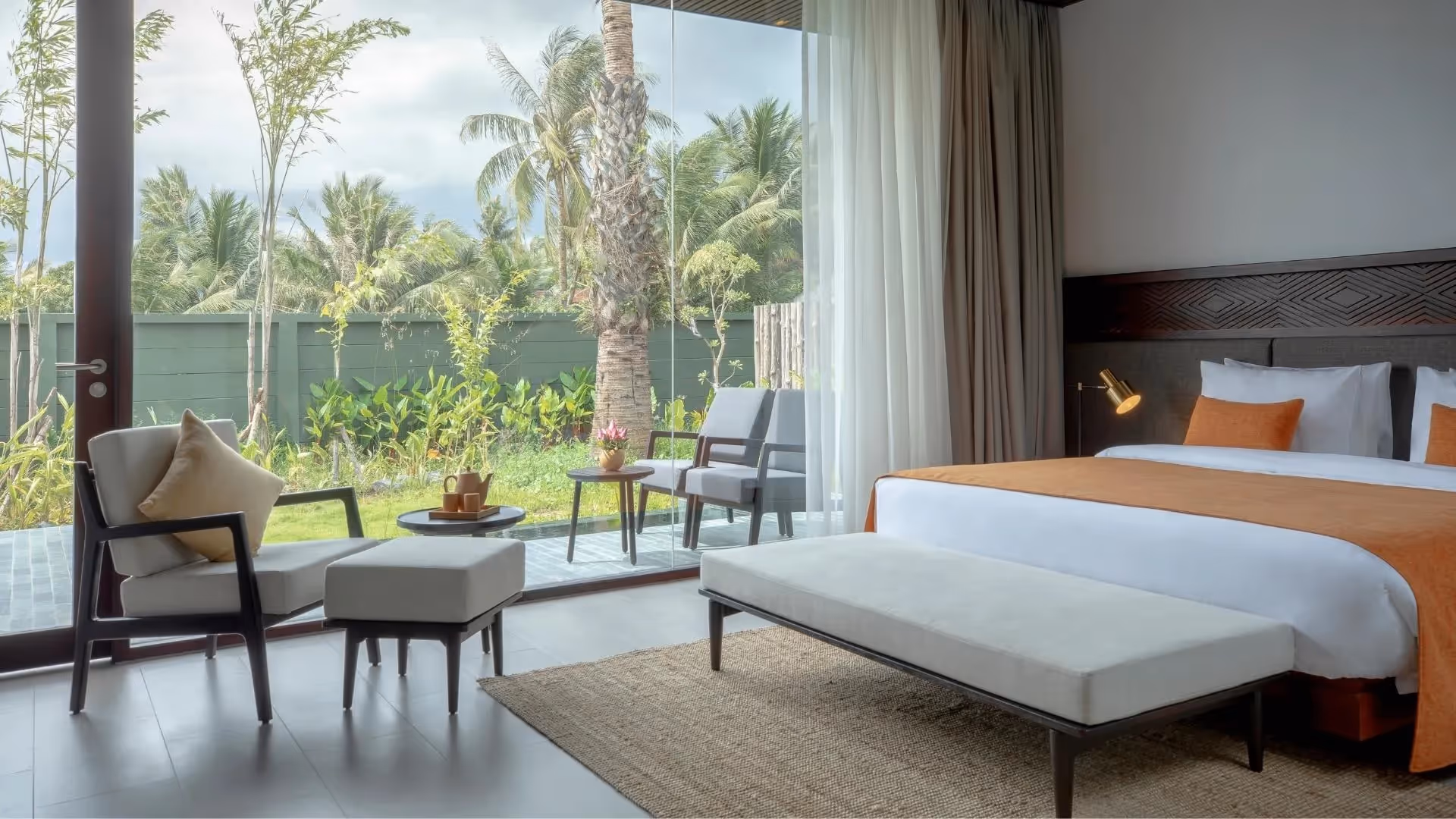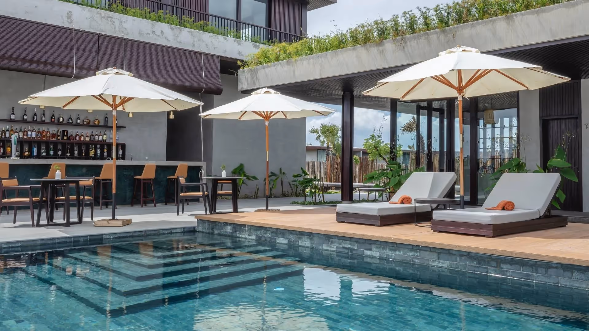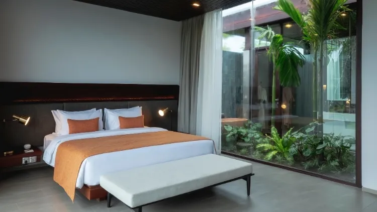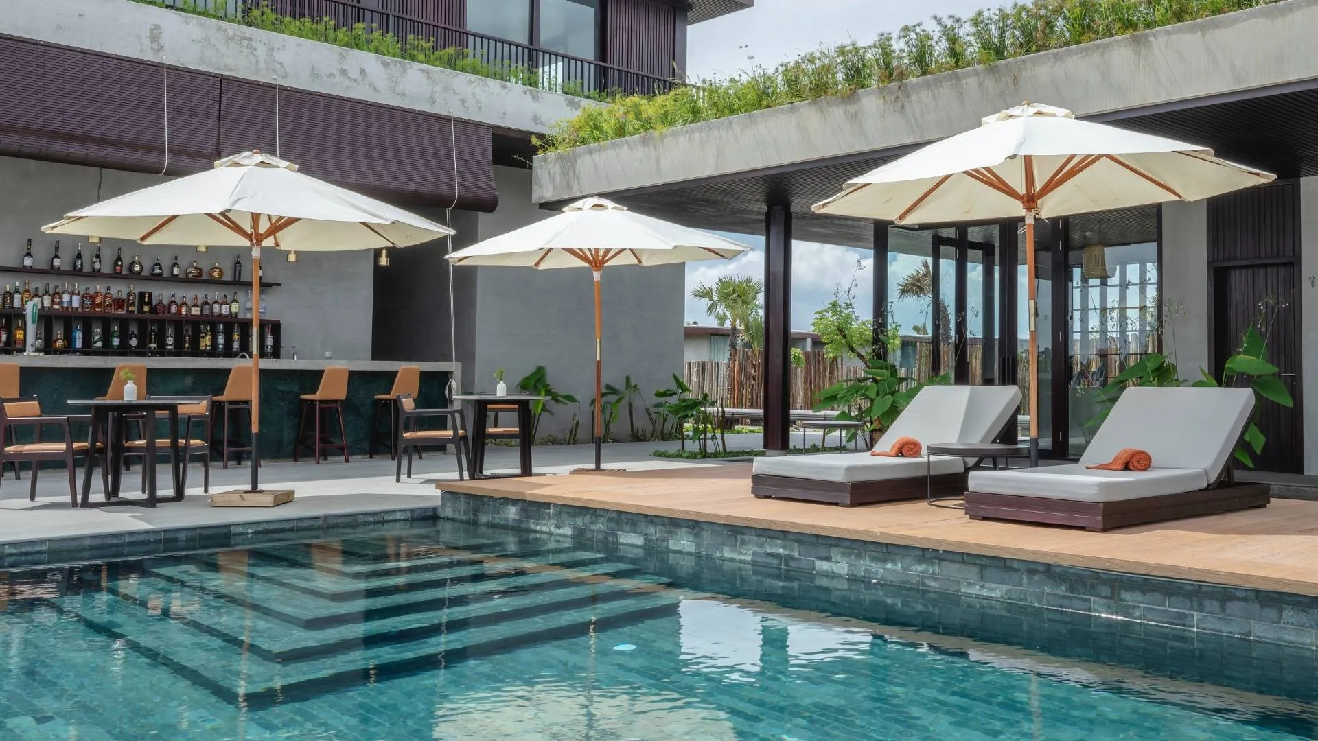 Die 25 Poolvillen zeichnen sich durch ein schlichtes Design mit Holzelementen und lebendigen Farbtupfern aus, das ihre elegante Atmosphäre unterstreicht. Umgeben von tropischem Grün können Sie im privaten Atrium in der Badewanne entspannen oder auf den Sonnendecks unter freiem Himmel die Sonne genießen. Ein besonderes Highlight ist das kostenlose Frühstück, das Ihnen direkt im Zimmer serviert wird – sogar schwimmend im Pool.