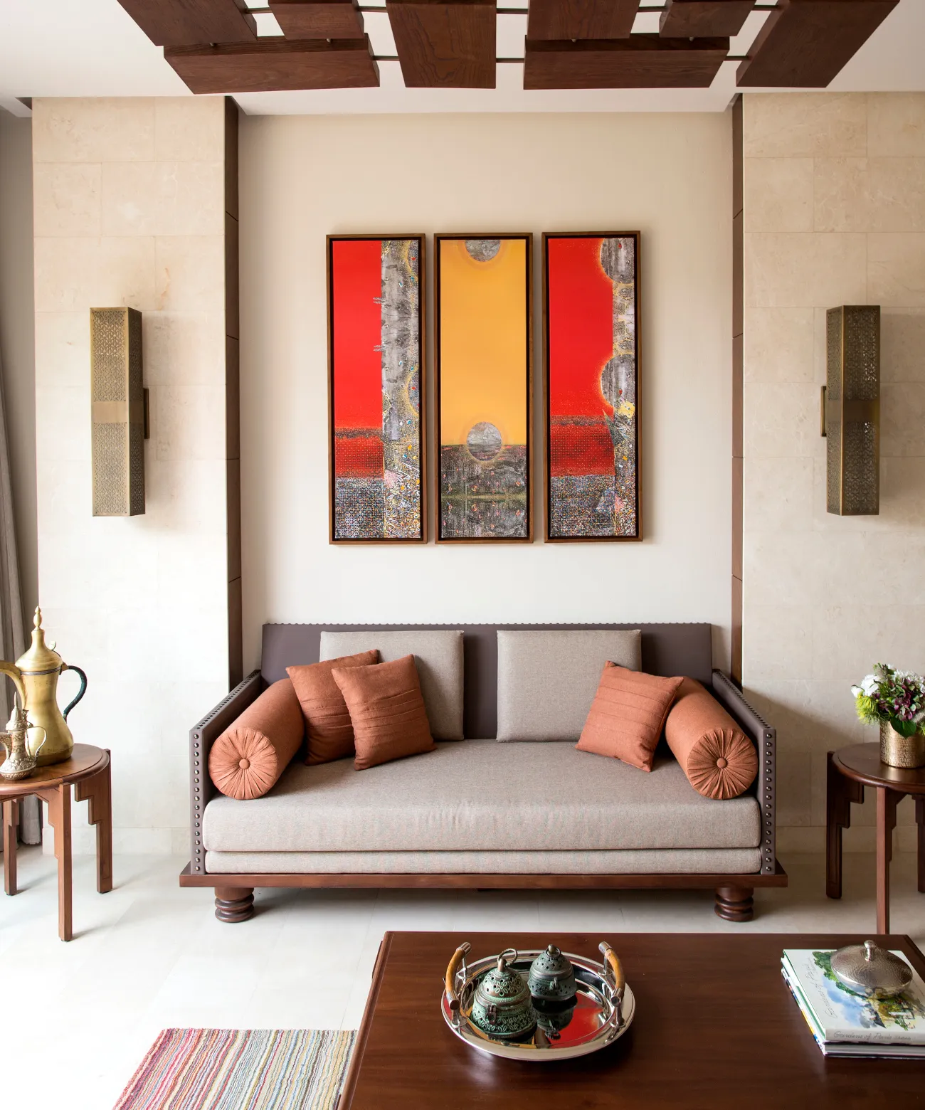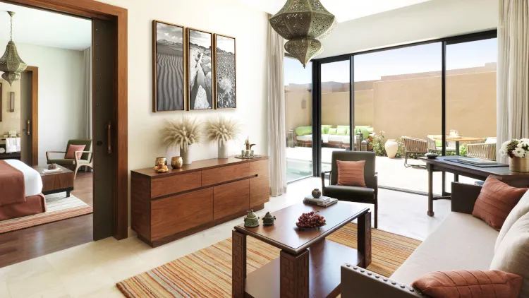 Die 178 m² große Deluxe Pool Villa bietet luxuriöse Privatsphäre mit eigenem Eingang und Innenhof. Bodentiefe Türen öffnen sich zum beheizbaren Pool im abgeschirmten Patio. Im Inneren verbinden sich omanische Designelemente mit modernem Komfort: ein großzügiger Wohnbereich, begehbarer Kleiderschrank, Regendusche und Badewanne sorgen für entspannte Stunden.