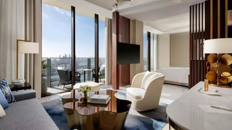 Entfliehen Sie in einer der 8 Junior Sky View Suiten, die mit atemberaubendem Blick auf die Palm Island und die Skyline von Dubai begeistern. Ideal für Paare, bietet die Suite luxuriöse Annehmlichkeiten wie ein italienisches Marmorbadezimmer und einen begehbaren Kleiderschrank. Mit 78 m² und einer 18 m² großen Terrasse genießen Sie großzügigen Raum und Privatsphäre.