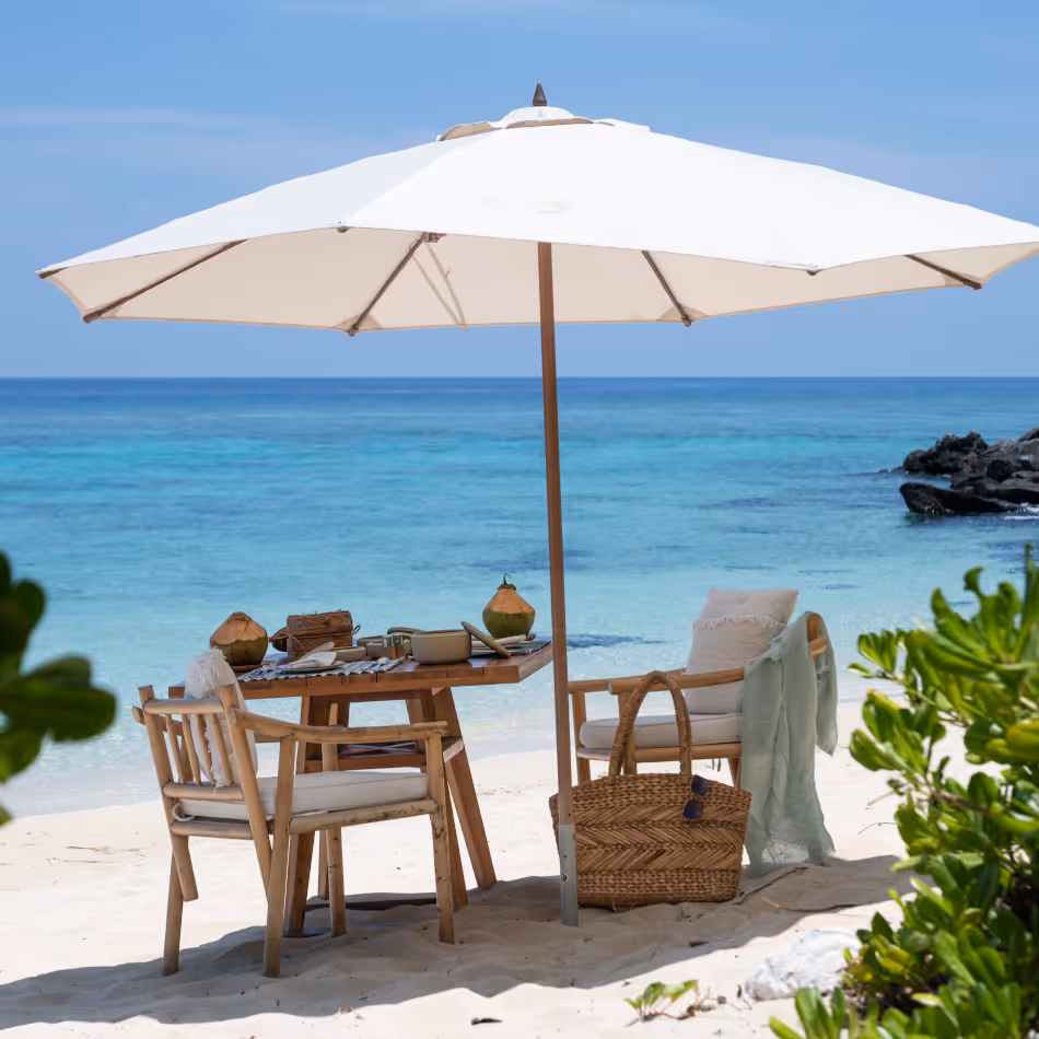 Die 70 m² große Tented Beach Suite hat die gleiche Ausstattung wie die Tented Oceanfront Suite, liegt aber direkt am puderfeinen, weißen Sandstrand. Auch diese Suite eignet sich bestens als privater Rückzugsort.