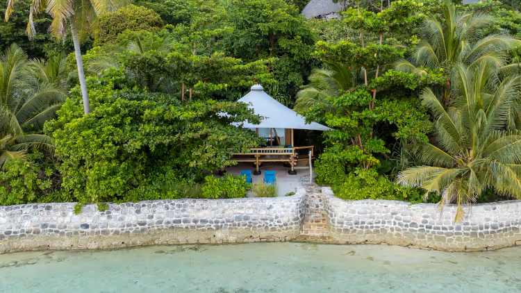 Die 70 m² große Safari-Style Tented Oceanfront Suite liegt direkt an der Lagune und bietet Meerblick, Sonne und schattige Bereiche. Die Veranda eignet sich für kulinarische Genussmomente oder zum Lesen. Das Badezimmer ist mit Kupferbadewanne, separater Regendusche und Doppelwaschtisch ausgestattet. Klimaanlage, Ventilatoren sowie Spa- und Wellbeing-Angebote sorgen für Komfort.