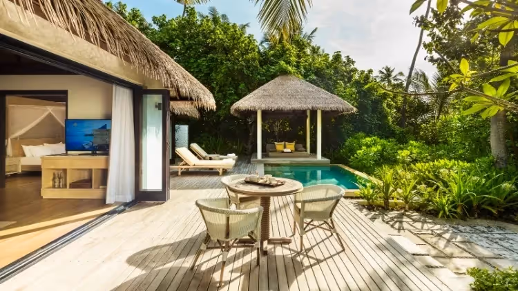 Die One–Bedroom Suite bietet auf 101 m² eine private Gartenlandschaft, direkten Zugang zum Strand und einen eigenen Pool – ein idyllischer Rückzugsort für bis zu vier Gäste, darunter drei Kinder.