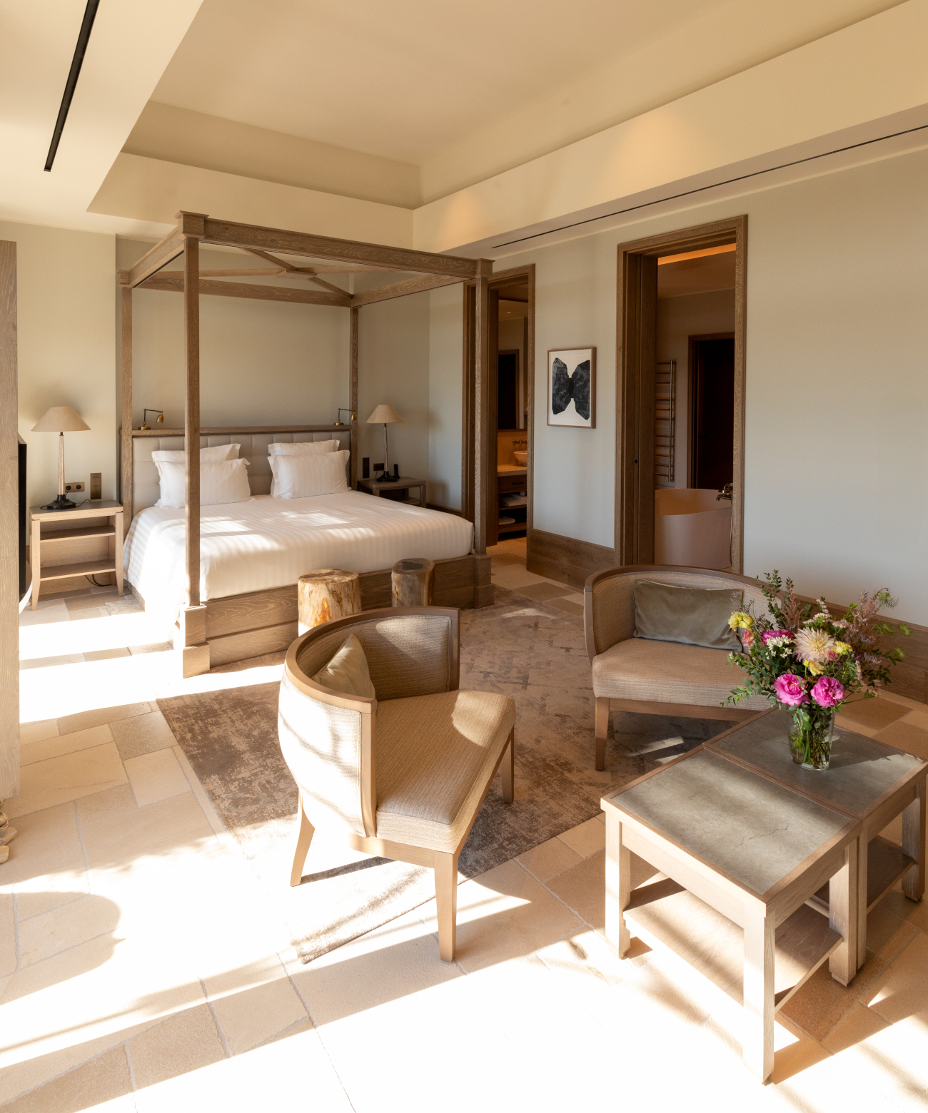 Mit 41 bis 57 m² Wohnfläche bieten die 25 Junior Suiten einen stilvollen Rückzugsort im Herzen der Provence. Ausgestattet mit einem Kingsize-Bett, einem gemütlichen Wohnbereich mit Sofa oder Sesseln sowie einem großzügigen Badezimmer mit Dusche und/oder Badewanne, sind sie ideal für entspannte Tage zu zweit.