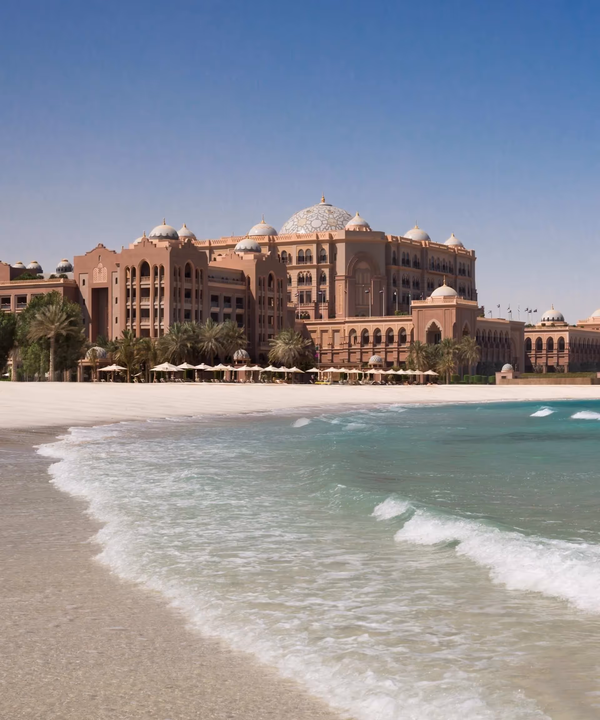 Abu Dhabi hat mit seinem neu erschaffenen Wahrzeichen Emirates Palace, ein Mandarin Oriental Hotel, neue luxuriöse Maßstäbe gesetzt. Der Märchenpalast aus 1001 Nacht liegt mitten eines 100 ha großen Park-Areals direkt am feinen Sandstrand Abu Dhabis und übertrifft alle bisherigen Angebote arabischer Top-Hotellerie: Luxus, soweit das Auge reicht! Ausgestattet mit feinsten Materialien, orientiert sich die Inneneinrichtung farblich an der all gegenwärtigen Wüste – strahlendes Licht, gepaart mit luxuriösem Ambiente. Gekrönt wird dieser Palast von einer 72 m hohen Kuppel, die weitere 113 vergoldete kleinere Kuppeln überragt und in der Sonne wie pures Gold glänzt. Hier wohnt es sich tatsächlich majestätisch.