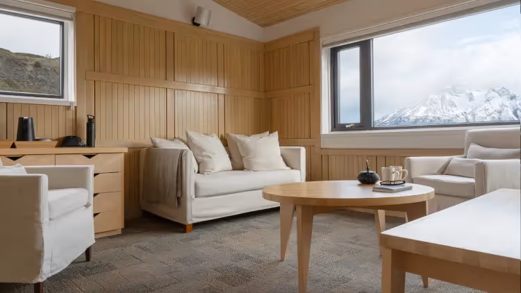 Die 42 m² große Suite bietet Platz für bis zu zwei Personen und beeindruckende Panoramablicke auf den Macizo del Paine. Eine gemütliche Sitzecke vor einem großen Fenster lädt zum Entspannen ein. Modernste Annehmlichkeiten, darunter eine extra Heizung und Whirlpool-Badewanne, sorgen für höchsten Komfort.