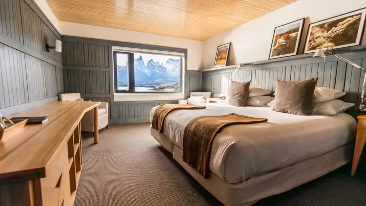 Die berühmten Zinnen der Torres und der tosende Wasserfall Salto Chico, der direkt neben der Lodge in den Pehoé-See mündet, bilden das atemberaubende Panorama für 50 komfortabel ausgestattete Zimmer und Suiten. Rustikale Holzelemente verleihen den modernen Unterkünften ein authentisches, landestypisches Ambiente. Ganz bewusst verzichten die Zimmer bei Explora auf Fernsehen und WLAN. In den öffentlichen Bereichen stehen Fernsehen und Wi-Fi selbstverständlich zur Verfügung.