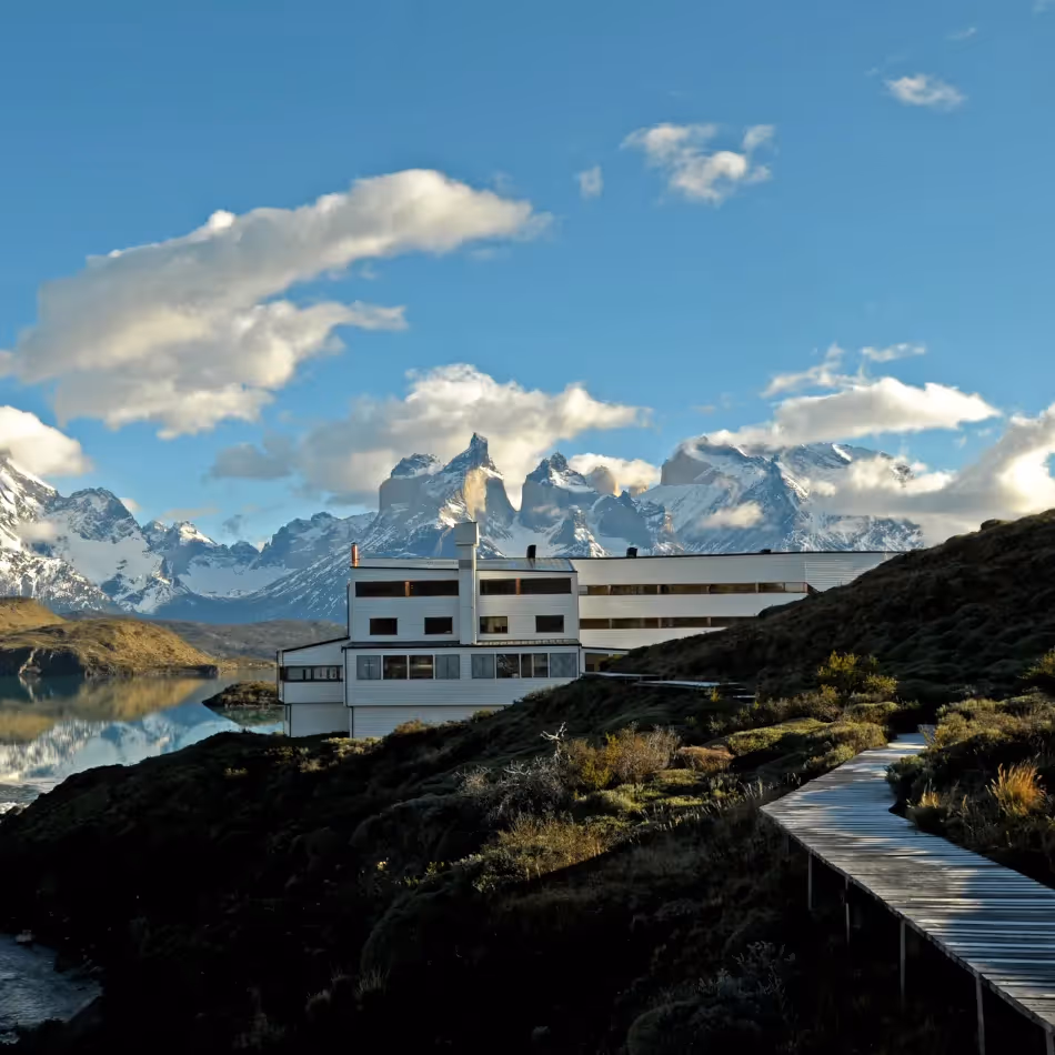 Willkommen im Explora Torres del Paine, einem außergewöhnlichen Luxushotel mitten in der einsamen Wildnis des Torres-del-Paine-Nationalparks. Explora Hotels sind bekannt für ihre Lage an den entlegensten Orten der Welt – und dieses Hotel übertrifft jede Vorstellung: Am Rande des Salto-Chico-Wasserfalls gelegen, fügt sich das kantige, modernistische Gebäude harmonisch in die raue Landschaft ein. Dahinter erhebt sich das mit Schnee bedeckte Bergmassiv, das mit seiner Gewaltigkeit selbst die Architektur des Hotels optisch übertrumpft.