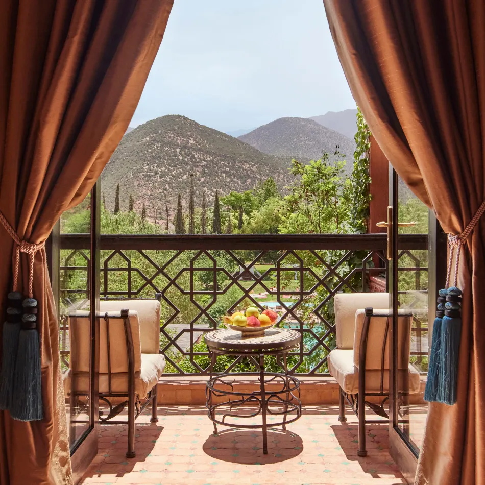 Mit einer Fläche von 35 bis 50 m² bieten die Deluxe Suites beeindruckende Ausblicke auf das Tal und die majestätischen Gipfel des Atlasgebirges. Geschmackvoll gestaltete Sitzbereiche laden zum Verweilen ein und schaffen eine behagliche Wohlfühlatmosphäre. Eine der Suiten verfügt über zwei Einzelbetten, die bei Bedarf zu einem großzügigen Kingsize-Bett verbunden werden können – perfekt für individuellen Komfort.