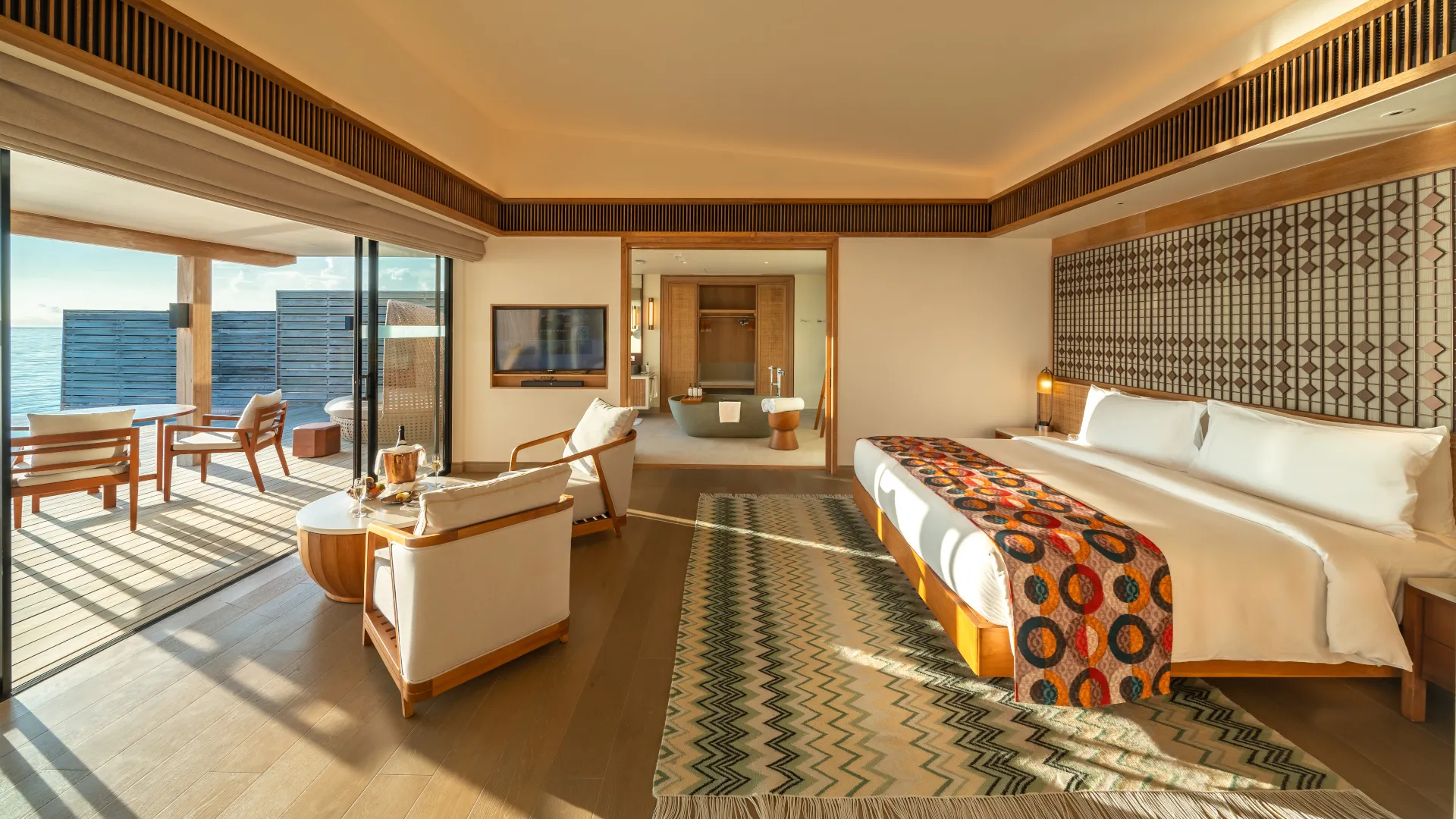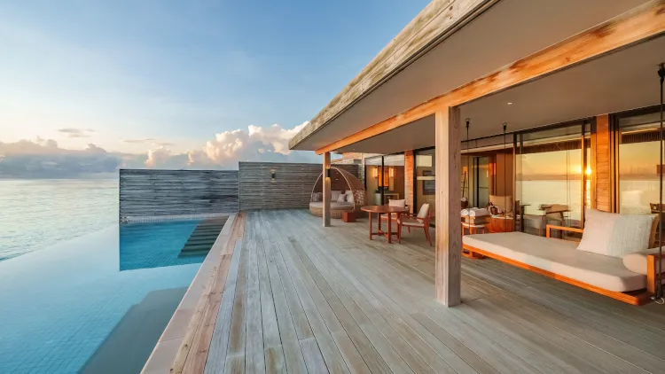In der Sunset Water Villa mit Privatpool erwachen Sie über dem türkisblauen Ozean – umgeben von Ruhe, Licht und Weite. Genießen Sie den Sonnenuntergang vom privaten Infinity-Pool (10 x 4 m) oder steigen Sie direkt ins kristallklare Meer unter Ihrer Villa. Auf 182 m² vereint sich modernes Design mit tropischer Leichtigkeit. Stimmungsvolle Beleuchtung, Regendusche, Badewanne sowie persönlicher Butler- und Turndown-Service sorgen für höchsten Komfort.