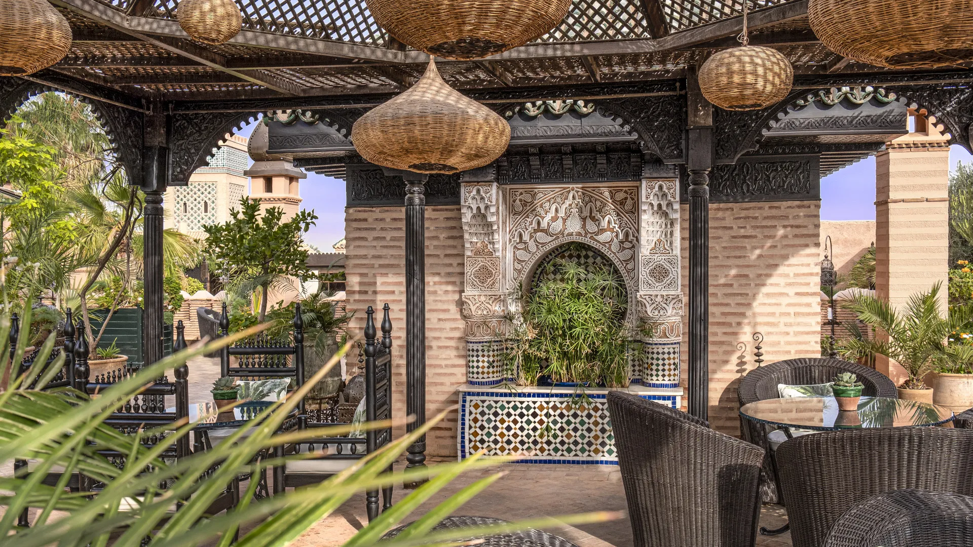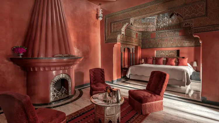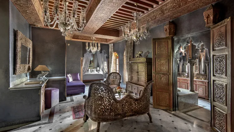 Das Hotel besteht aus fünf kunstvoll miteinander verbundenen Riads und beeindruckt mit prächtigen, handgeschnitzten Holzarbeiten, kunstvoll bemalten Decken, traditionellen Zellij-Mosaiken und filigranen Stuckverzierungen. Jedes Detail erzählt eine Geschichte und vereint jahrhundertealte marokkanische Handwerkskunst mit zeitloser Raffinesse.