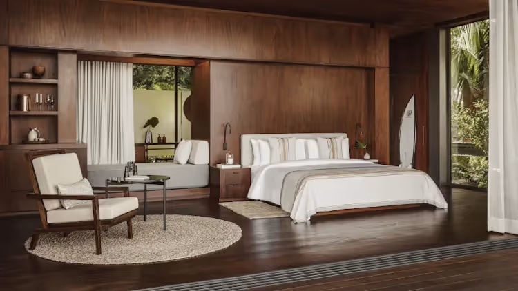 Bodenhohe Schiebetüren verbinden Wohn- und Schlafbereiche, während frische Meeresbrisen die Luft erfüllen. Genießen Sie Mahlzeiten al fresco am privaten Pool oder lassen Sie sich mit kulinarischen Köstlichkeiten im stilvollen Lounge- und Essbereich verwöhnen. Die Villa bietet Platz für vier Personen und ist ausgestattet mit einem King-Size-Bett und einem Queen-Schlafsofa.