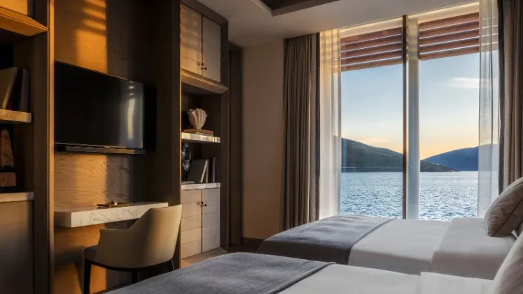 Die Suite beeindruckt mit großzügigen 295 m² und einer privaten Terrasse von 79 m², die einen atemberaubenden Blick auf die umliegenden Berge und die Bucht bietet. Zu den modernen Annehmlichkeiten gehören ein privater Aufzug, ein separater Eingang sowie ein exklusiver Butlerservice. Die Suite bietet Platz für bis zu zwei Erwachsene und zwei Kinder.