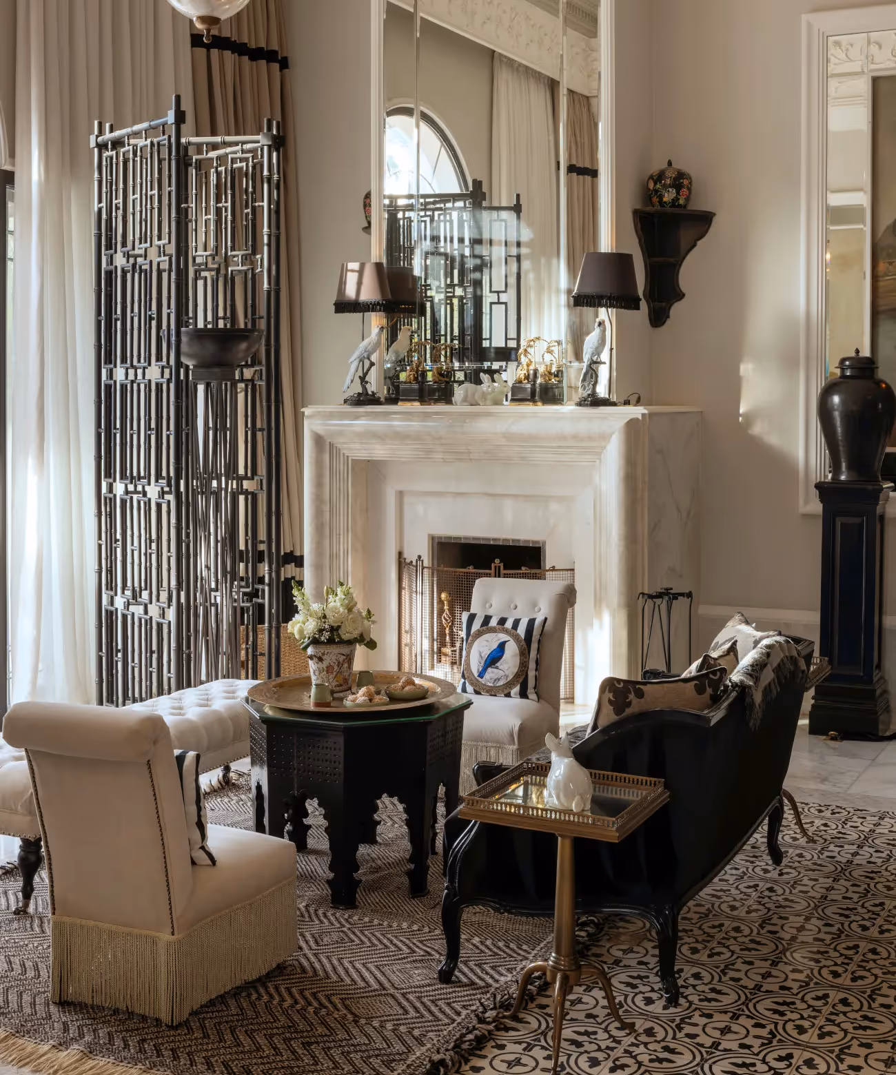 Auf großzügigen 60 m² entfaltet sich eine Atmosphäre von zeitloser Eleganz, in der florale Stoffe kunstvoll mit einer orientalischen Tischgarnitur, barocken Lampen und prachtvollen marokkanischen Vasen verschmelzen – ein harmonisches Zusammenspiel verschiedener Stilrichtungen und Epochen.