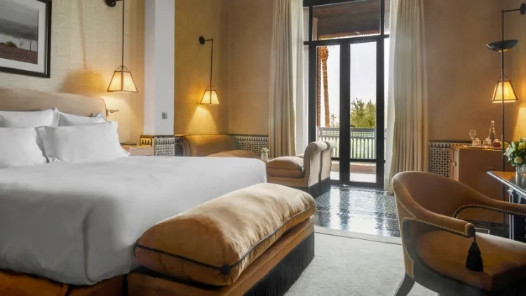 Mit Blick auf den Pool oder die Gärten vereinen diese 55 m² großen Zimmer stilvolle Schlichtheit mit kunstvollen Details von Jacques Garcia. Geschnitztes Holz, genietetes Leder und emaillierte Zelliges schaffen eine warme, entspannte Atmosphäre.