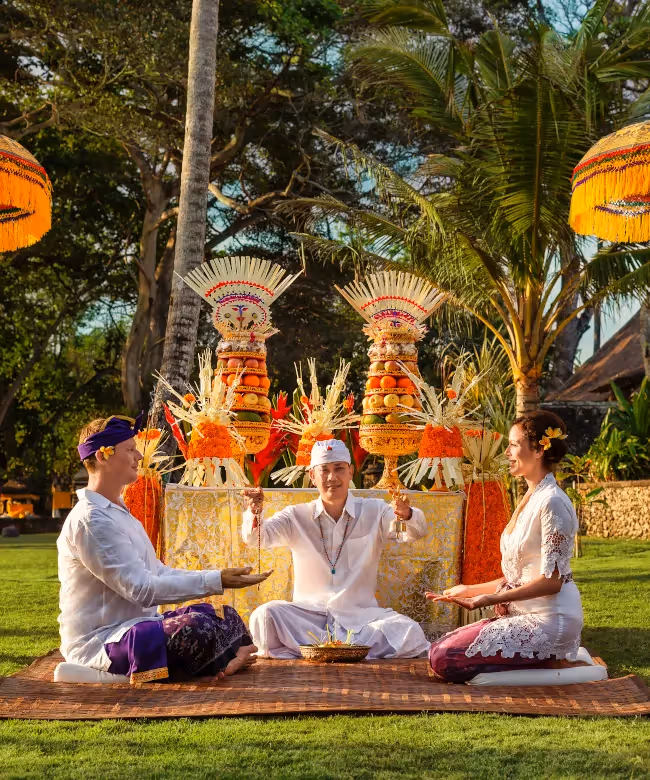 Romantische Momente bietet ein Vollmondritual-Abend mit traditioneller balinesischer Kleidung und privatem Dinner am Strand, die Möglichkeit, die Ehegelübde in einer balinesischen Zeremonie zu erneuern, oder eine Sonnenuntergangs-Segnung im mystischen Petitenget-Tempel, begleitet von einem lokalen Priester und Experten.