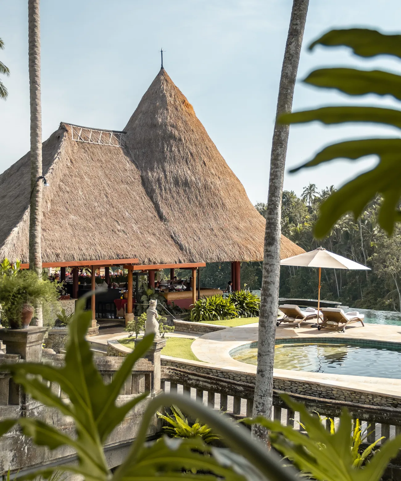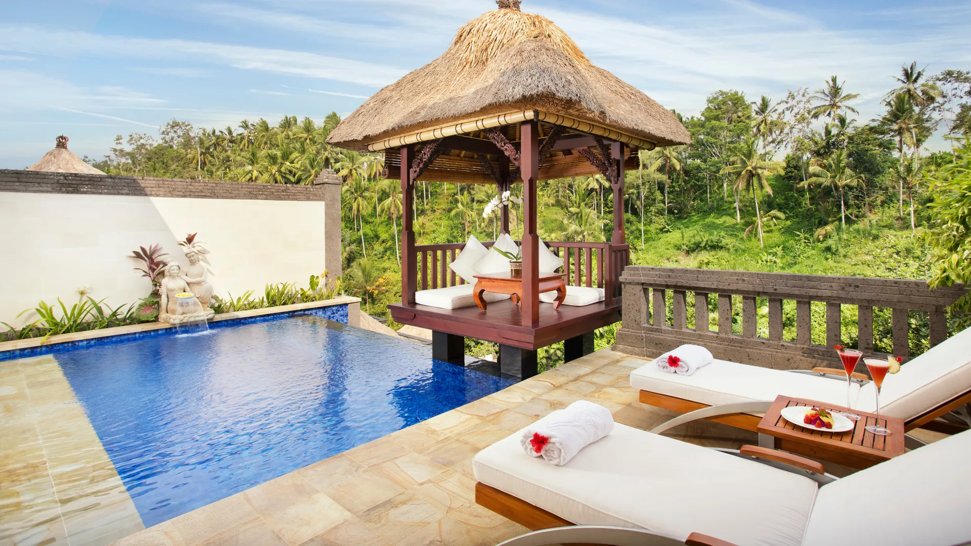 Die Terrace Villa besticht durch ein traditionelles Balé über dem privaten, beheizten Pool (3,5 × 3,5 m, 12,25 m²) mit Blick auf den Dschungel von Ubud. Mit Dach aus Alang-Alang-Gras, offenem Marmorbad und großzügigem Wohnbereich bietet die Villa Luxus und Entspannung zugleich.