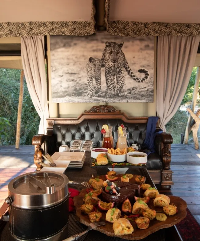 Im Zarafa Camp wird Kulinarik auf höchstem Niveau zelebriert – mit frischen, saisonalen Zutaten und maßgeschneiderten Menüs, die den individuellen Vorlieben der Gäste entsprechen. Die Küche setzt auf Nachhaltigkeit und bezieht, wo immer möglich, regionale Produkte. Ob feines Wildfleisch, fangfrischer Fisch oder vegetarische Spezialitäten – jede Mahlzeit ist ein Fest für die Sinne.Die Gäste genießen ihre Speisen in verschiedenen, stimmungsvollen Settings: im offenen Speisebereich mit Blick auf die Lagune, ganz privat auf der eigenen Terrasse oder unter dem funkelnden Sternenhimmel beim traditionellen Boma-Dinner am Lagerfeuer. Vom entspannten Frühstück mit Blick auf vorbeiziehende Elefanten bis hin zu mehrgängigen Gourmet-Dinnern – jede Mahlzeit im Zarafa Camp verbindet höchste Kochkunst mit der unberührten Wildnis Botswanas und wird so zu einem unvergesslichen Erlebnis.