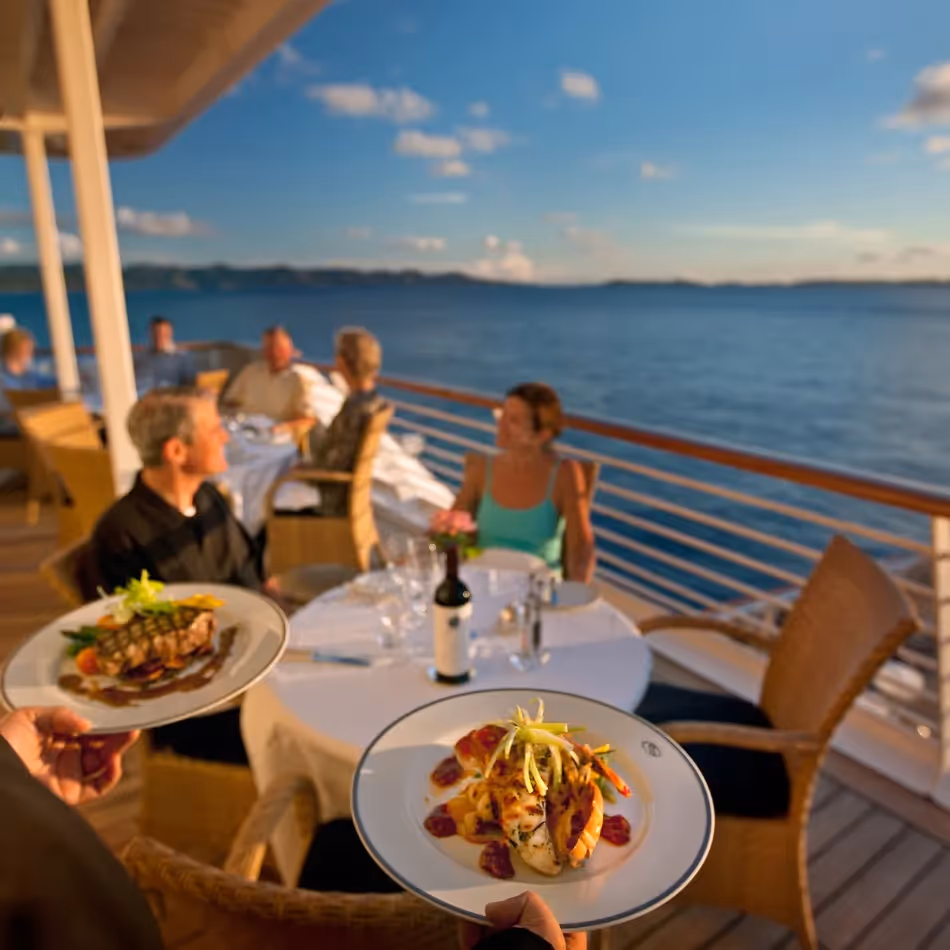 Auf Ihrer Reise mit SeaDream Yacht Kreuzfahrten sind alle Mahlzeiten und Getränke, auch alkoholische Getränke wie Champagner oder Cocktails, bereits im Reisepreis inkludiert. An Bord haben Sie die Auswahl zwischen verschiedenen kulinarischen Besonderheiten: Das preisgekrönte Küchenpersonal kreiert täglich wechselnde Menüs, die internationale Haute Cuisine mit regionalen Spezialitäten verbinden. Im eleganten Dining Salon genießen Sie ein 5-Gänge-Menü in ungezwungener Atmosphäre ohne feste Sitzzeiten. Besonders beliebt ist das "Dining under the Stars" auf dem Deck, wo Sie bei sanfter Musik und unter freiem Himmel speisen können.Die Sommeliers begleiten außerdem jede Mahlzeit mit erlesenen Weinen aus dem umfangreichen Weinkeller, während das Topside Restaurant tagsüber leichte, gesunde Küche mit Bio-Produkten und veganen Optionen anbietet. Ein besonderes Highlight sind die Koch-Workshops, bei denen Sie gemeinsam mit dem Chefkoch lokale Spezialitäten zubereiten und dabei Insider-Tipps erhalten. Auf Ihrer Reise wird das kulinarische Angebot durch den 24-Stunden-Zimmerservice mit einer exquisiten Auswahl an Speisen und Getränken komplettiert.